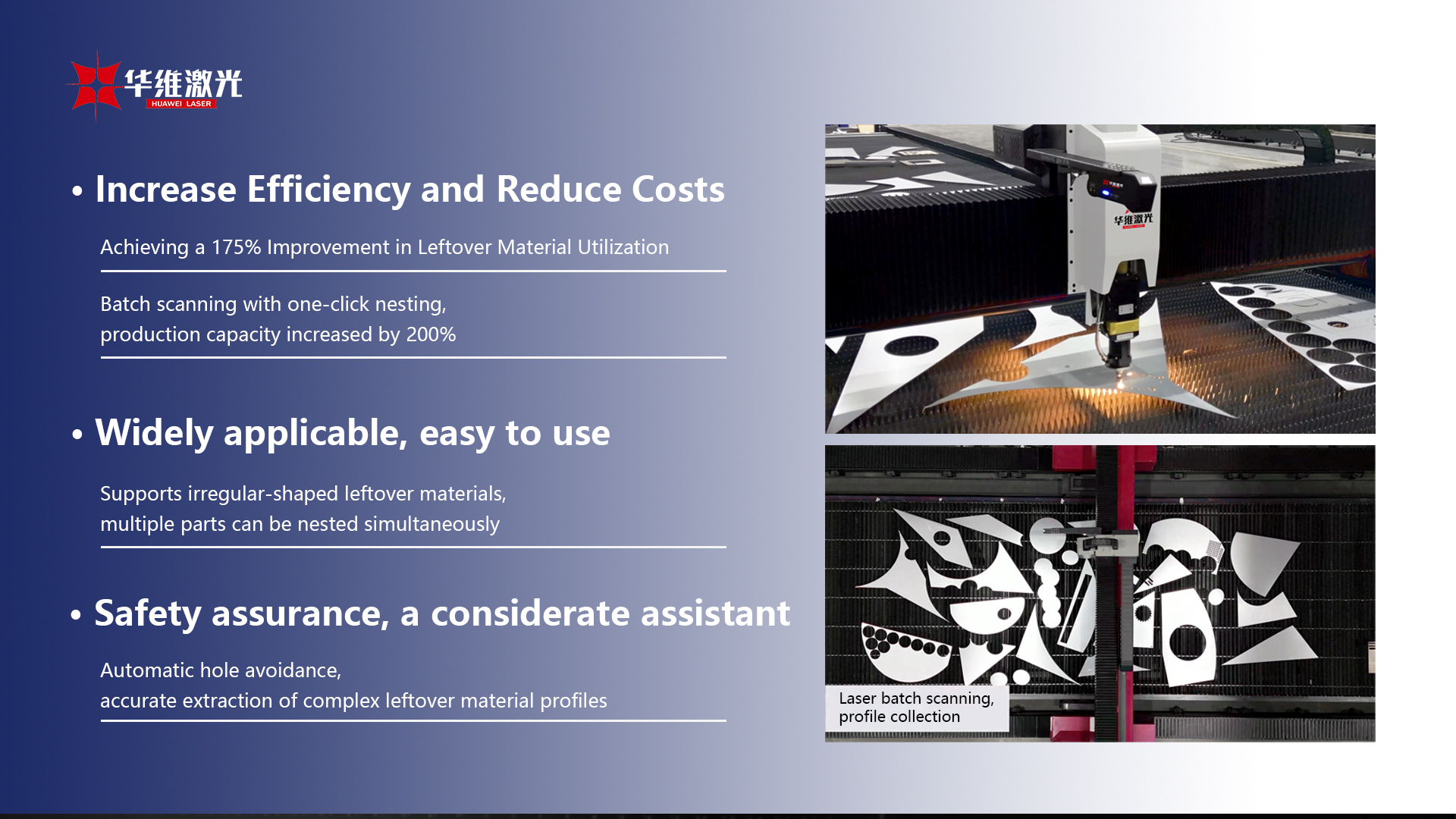 14. februar 2025 -Huawei Laser Equipment Manufacturing Co., Ltd.(i det følgende benævnt "huawei laser") har officielt lanceret sinSeneste intelligente skrot reutiliseringssystem. Denne innovative løsning sigter mod at give laserskærings- og forarbejdningsindustrien en mere effektiv og præcis skrotstyringsmetode. Ved at integrere avanceret laserbatch -scanning og intelligent hekke -teknologi forbedrer systemet ikke kun væsentligt skrotudnyttelse, men reducerer også effektivt produktionsomkostningerne, hvilket hjælper virksomheder med at opnå omkostningsreduktion og effektivitetsforbedring på det meget konkurrencedygtige marked.