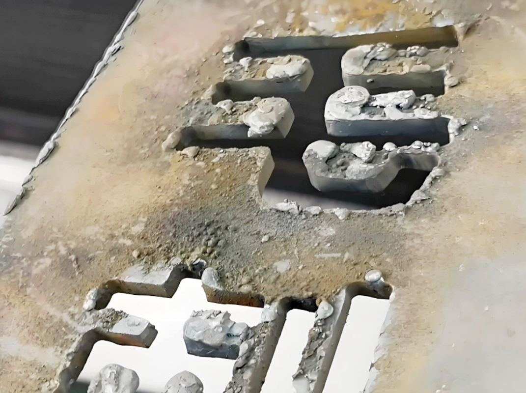 Over for langsom skæring forårsager ujævn smeltning, hvilket efterlader resterende slagge på den skårne overflade.